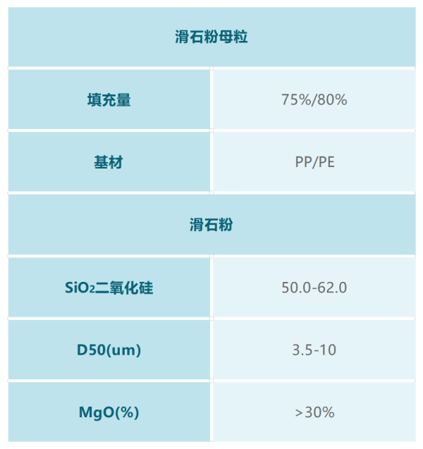 滑石粉母粒:滑石粉母粒是一款优良的塑料高填充改性填料产品,主要成分为滑石粉与高融共聚聚丙烯混合造粒而形成的粒料,主要用于PP改性工程料。与滑石粉相比,滑石粉母粒具有良好的加工性能,改善了滑石粉的逸散问题,可改善改性工程塑料加工厂的加工环境,有效提升生产效率,降低损耗。