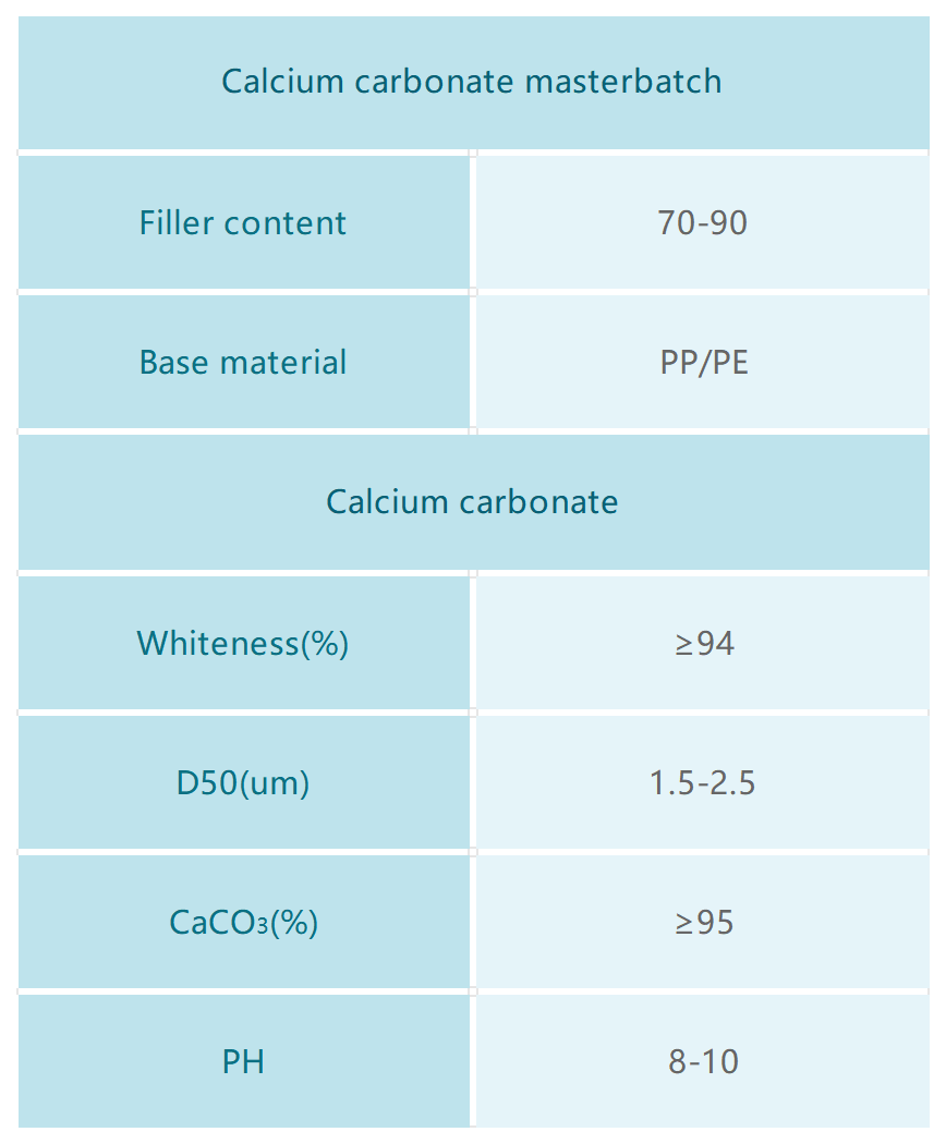 Calcium carbonate masterbatch is an excellent plastic high-filler modified filler product. It is mainly composed of calcium carbonate and carrier resins such as polypropylene (PP) or polyethylene (PE). This product has a fine and pure texture without impurities, good compatibility with other base materials of the products, superior processing performance, good dispersion, large amount of filler addition, non-toxic, not prone to moisture absorption and color change. Its high whiteness and quality cost performance are significantly higher than domestic calcium carbonate fillers. It can increase the hardness, whiteness, transparency, glossiness, smoothness of plastic products' surfaces, eliminate water marks on the products' surfaces, and improve the appearance of the products.